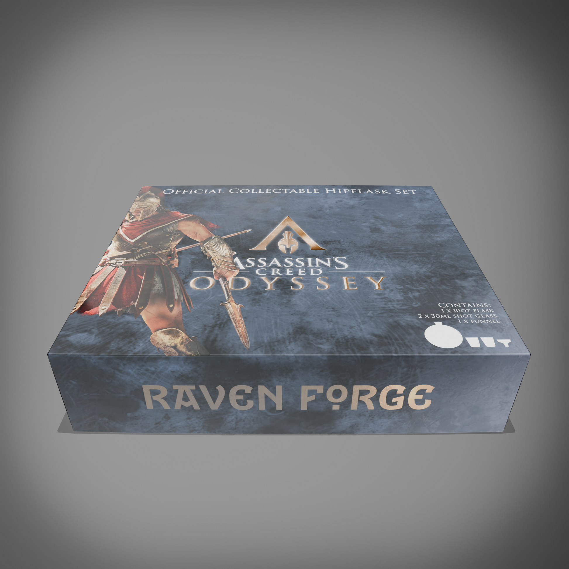I'm proud to present the Official Ubisoft® x Raven Forge Assassin's Creed Odyssey Hip Flask Gift Set. Every detail, from the stunning Gift box design with an internal Graphic to the mirror polished and debossed 10oz high-grade stainless steel flask has been meticulously designed by Raven Forge.