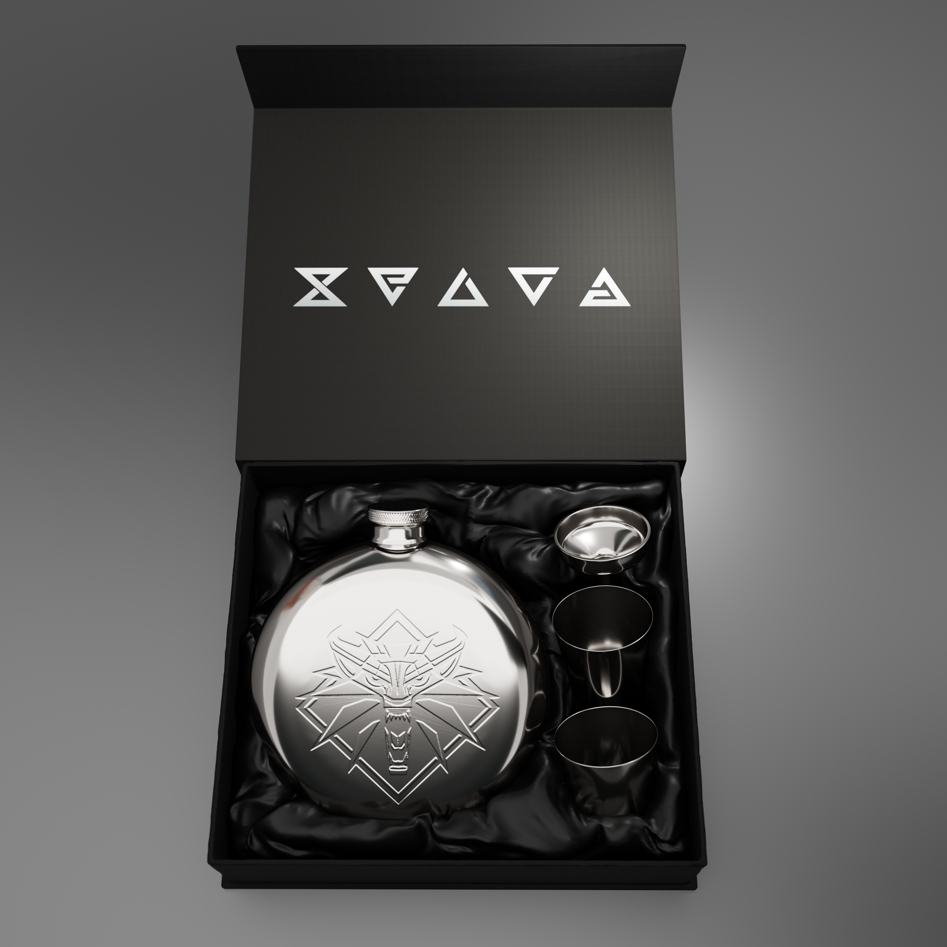 I'm proud to present the Official CD PROJEKT RED® x Raven Forge Witcher Hip Flask Gift Set. Every detail, from the stunning Gift box design with an internal symbols to the mirror polished and debossed 10oz high-grade stainless steel flask has been meticulously designed by Raven Forge. The flask, the filling funnel and the shot glasses are all nestled in a shroud of black cloth signifying the Witchers of Kaer Morhen and on the back, the official Raven Forge collectibles hologram.